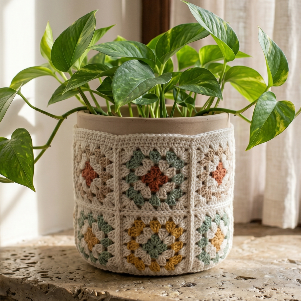 A granny square plant cover feels classic, colorful, and full of handmade personality. It is a wonderful project if you enjoy motif-based crochet and want something that looks creative without being too complicated. The squares give it a patchwork feel that is especially charming in cozy home decor spaces.