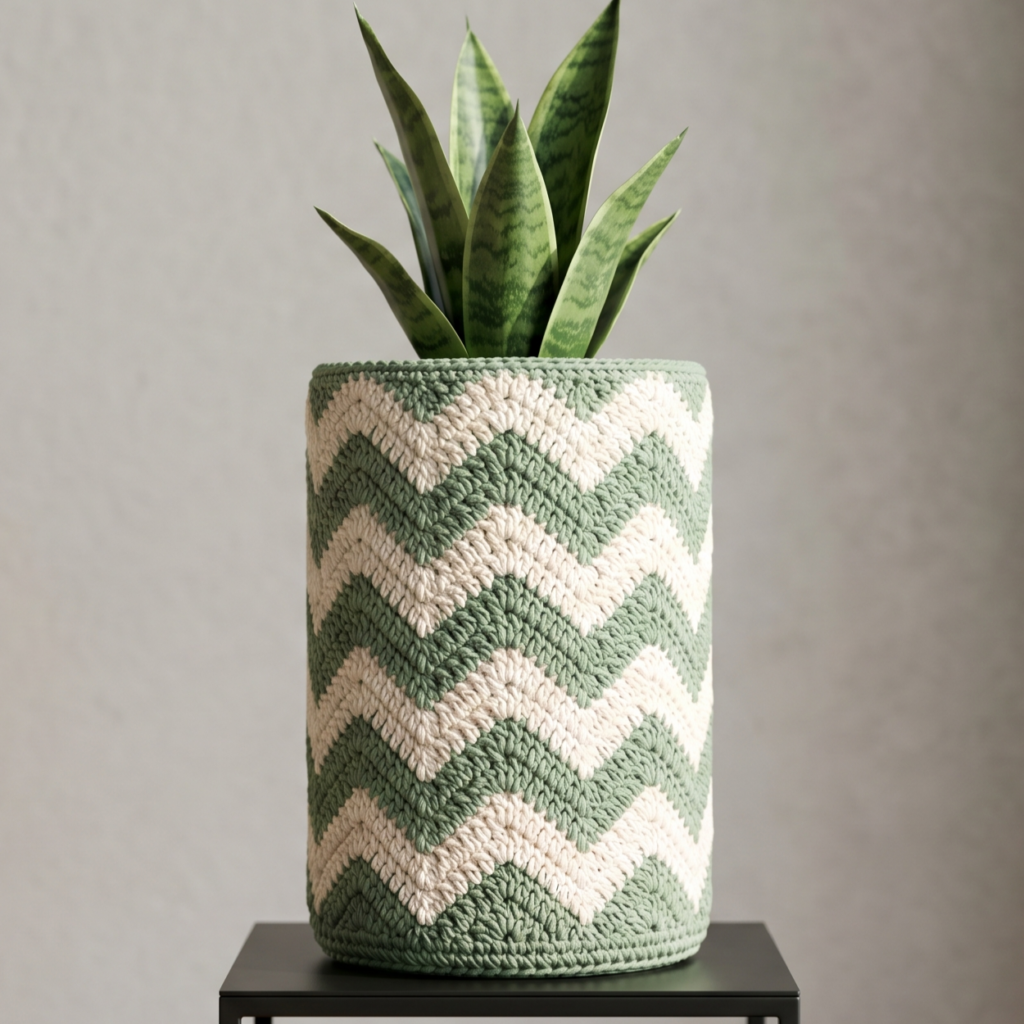 A V-stitch plant cover feels airy, textured, and slightly more modern. The repeating V shape creates a clean visual rhythm that looks especially nice on a shelf or windowsill. It is a lovely option if you want something light, pretty, and easy to pair with many types of home decor.