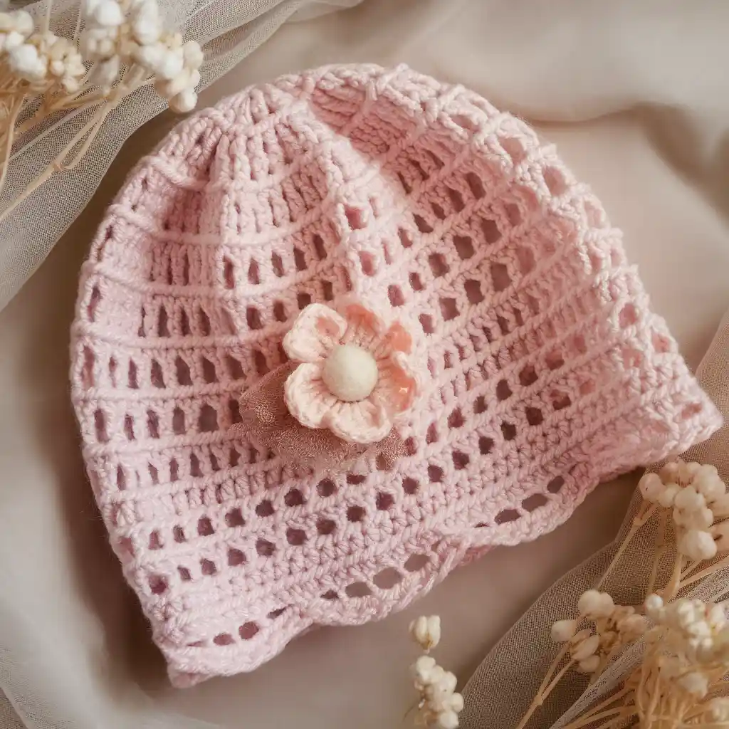 3. Crochet Lacy Baby Hat With Flower Pattern