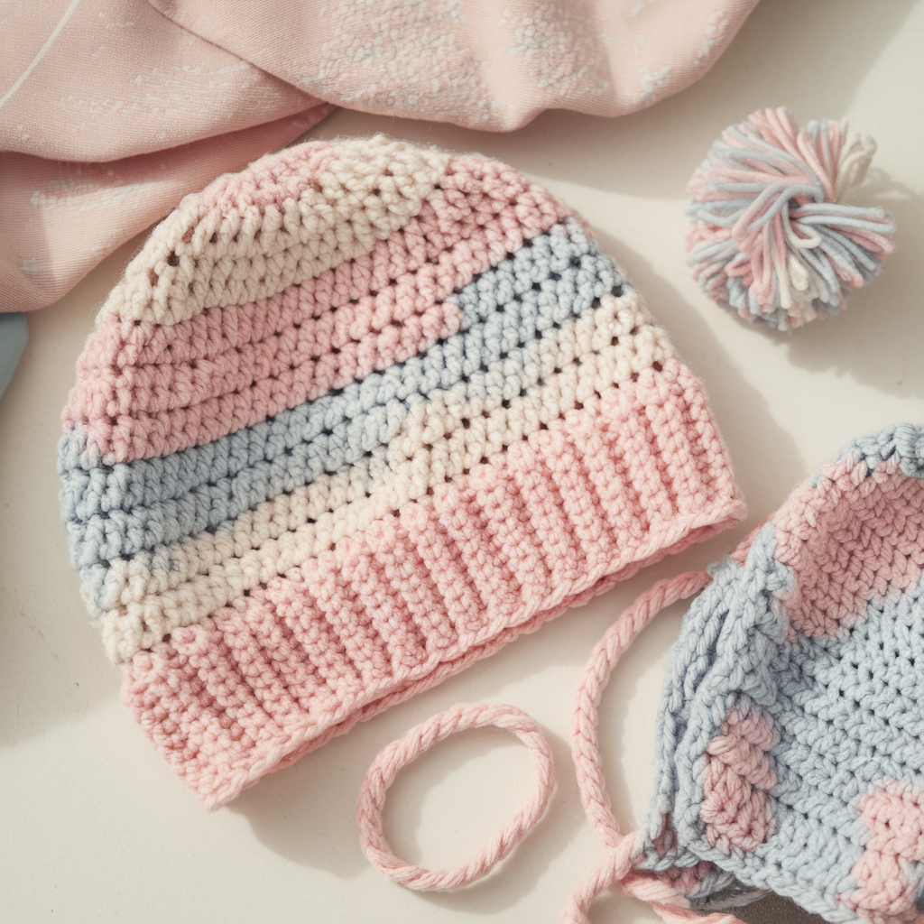 These five baby beanies — Ribbed Newborn, Simple Baby Hat, Lacy Flower Hat, Vertical Striped Beanie, and Rose Earflap Hat — are designed to be quick, adorable, and friendly for crocheters of all levels. Start with the sizing method (measure + swatch), follow the crown increase method to reach the stitch counts I provided (or calculate your own with the formula), then follow the stitch pattern and finishing notes. Pom-poms and appliqués add charm — but remember safety first: keep small bits secured and remove embellishments for sleeping babies.