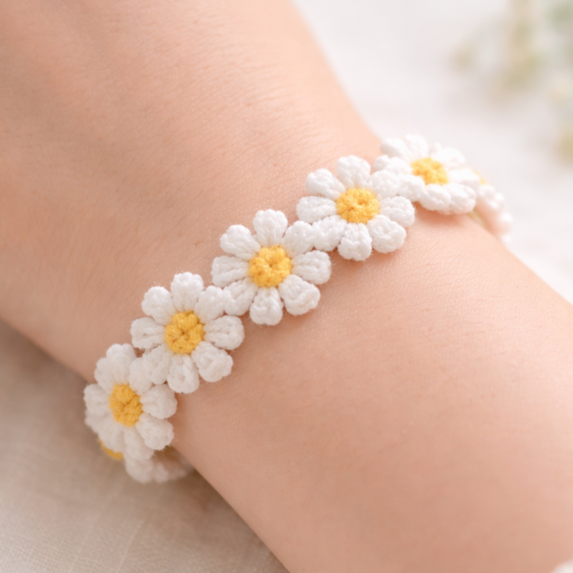 Crochet small daisy motifs separately. Keep each flower compact and even, with petals that are the same size. The flowers should feel cute and balanced rather than too large for the bracelet.