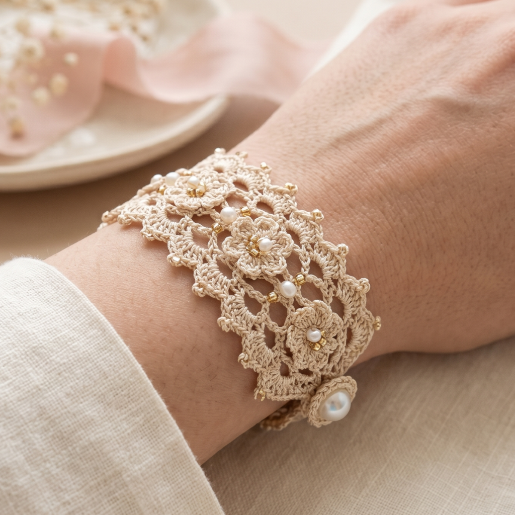 Lightly block the bracelet so the lace opens nicely and the flowers sit flat. Once dry, adjust the beads and trim any loose threads. A careful finish will make the cuff feel polished and gift-worthy.