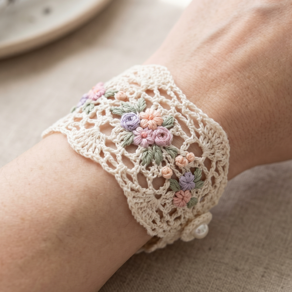 Use embroidery thread or a fine contrasting yarn to stitch small flowers onto the lace. Tiny blossoms, petals, or simple floral outlines can make the bracelet feel soft and feminine. Keep the flowers small and evenly spaced so the design looks tidy.