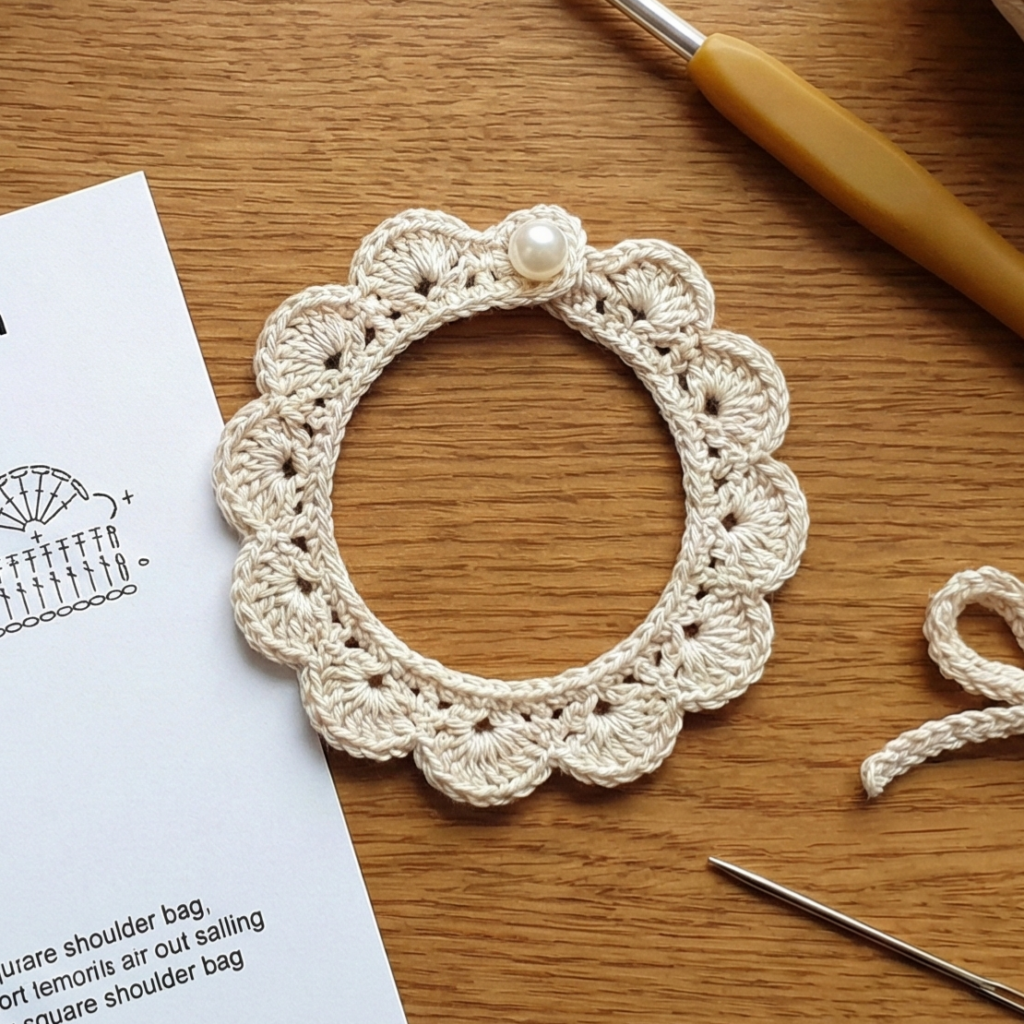 - Optional: work a picot row on inner edge to mirror scallops: sc across with picot every 4th stitch: sc, ch3, sl st in same st.
