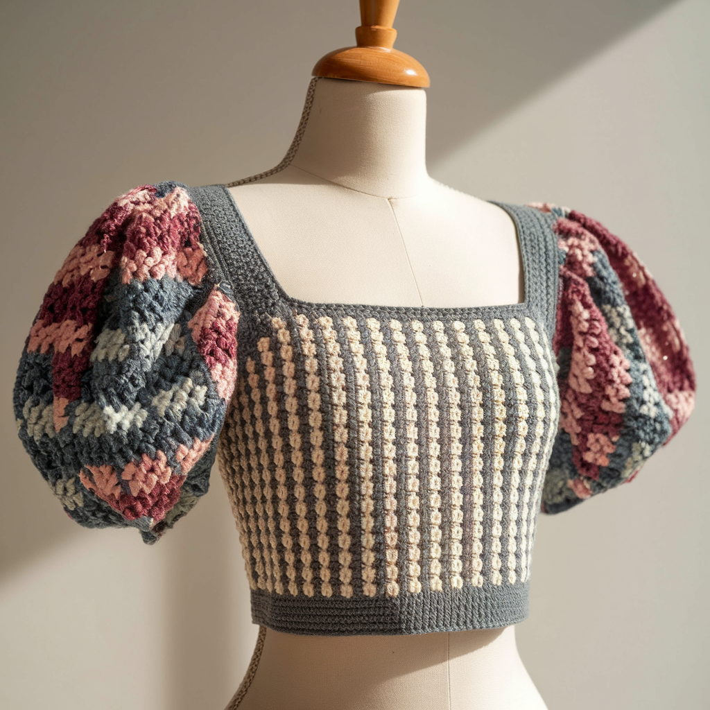 4. Crochet Gingham Puffy Sleeves Crop Top Pattern