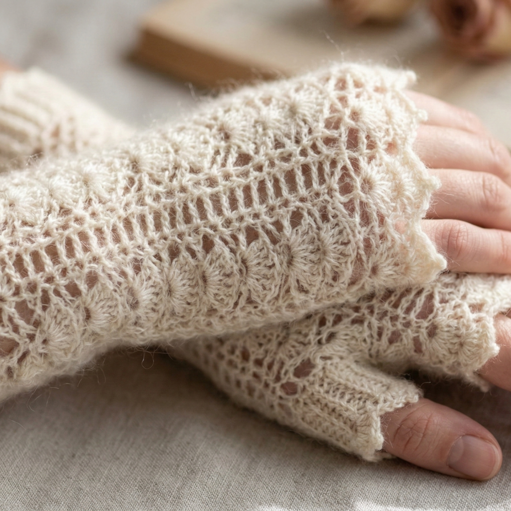 - To finish, work one round of single crochet to even everything, then a decorative scallop round: sl st in next 2, (ch 3, sl st into base) in next st — or work picots: dc, ch 3, sl st into top of last dc — giving a delicate vintage edge. Block gloves carefully to open stitches and set lace.