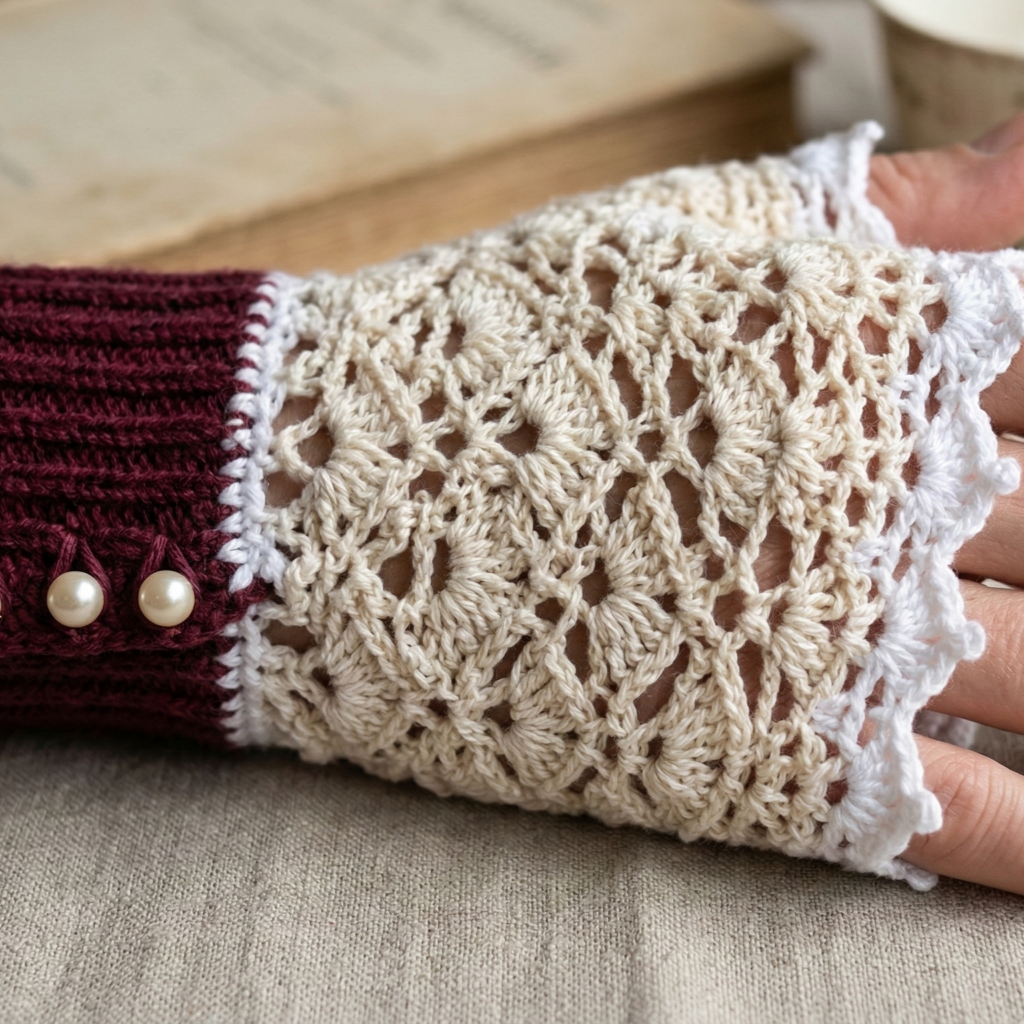 You now have five full, wearable patterns that span playful to elegant: Cupcake-inspired sweetness, airy fishnet edge, earthy spirals, delicate vintage lace, and romantic Victorian lace. Each pattern is designed to be adaptable — change yarn weight for warmth, tweak length for wrist or forearm coverage, and swap colors to match your wardrobe or mood.
