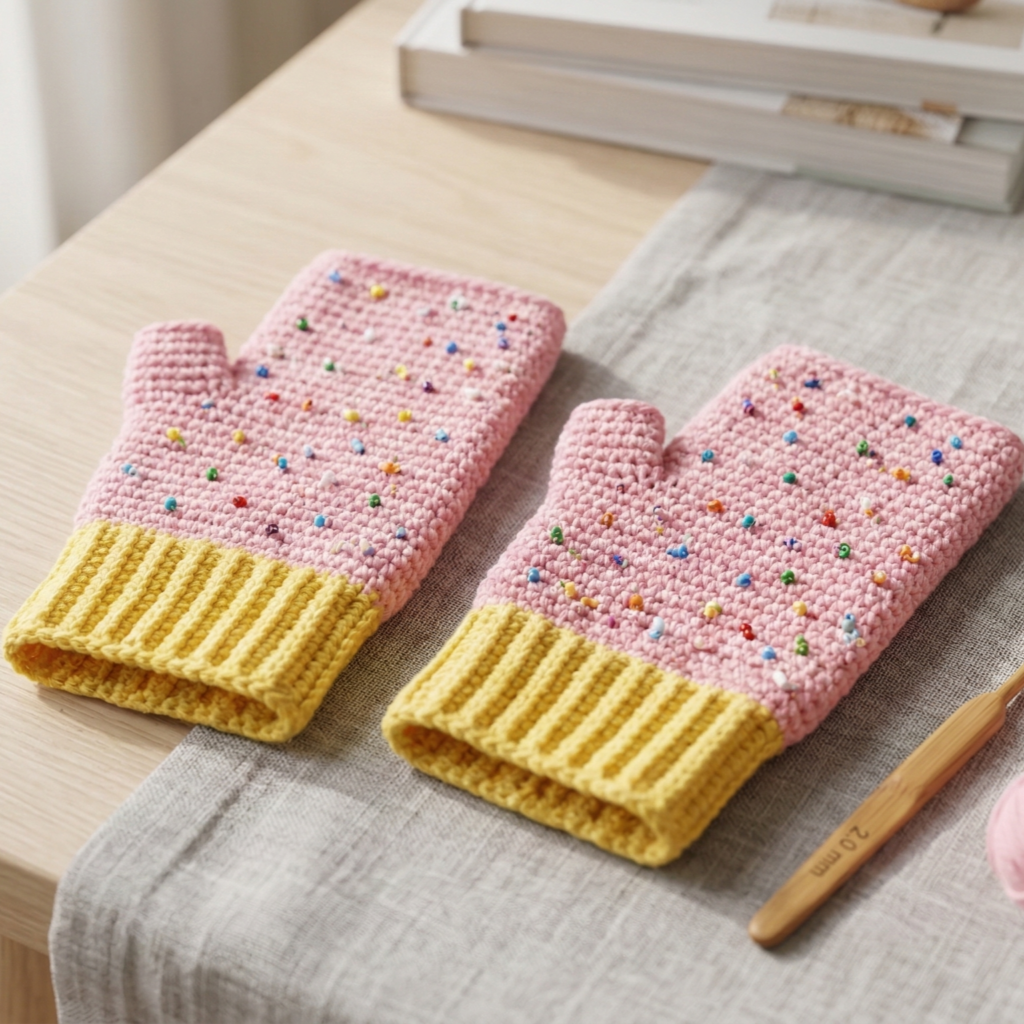 - Rnds 2–10: BLO sc around (9 rounds) — this creates a stretchy ribbed cuff that mimics cupcake wrapper pleats. Adjust length for wrist height: 9 rounds ≈ 2–2.5 in.