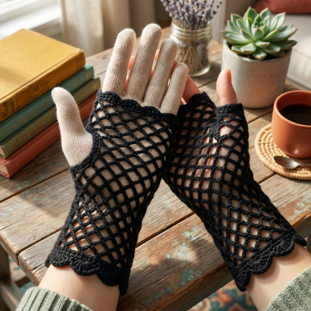 Open, airy, slightly edgy — these fishnet gloves work beautifully under coats or over bare skin for a layered look. Quick to make and great for summer evenings or festival wear. Uses simple chain/splice mesh pattern.