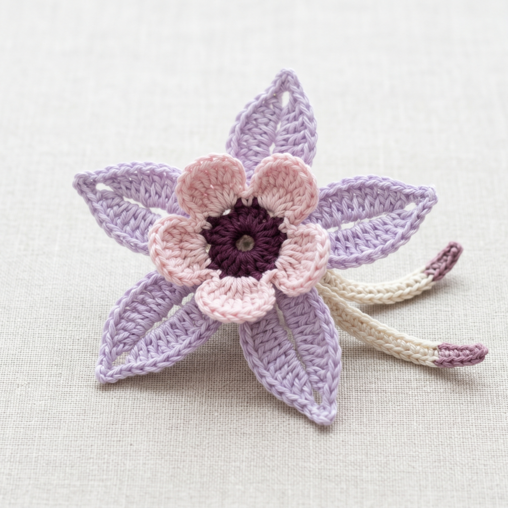 The outer petals of a columbine often extend outward or downward in a way that feels light and graceful. Use taller stitches and chain spaces to give these petals their flowing shape.