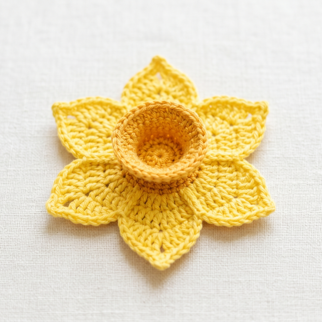 The daffodil’s trumpet is the heart of the flower. Begin with a small ring and crochet a short tube or rounded cone shape. This should stand out from the petals and form the recognizable middle of the daffodil.