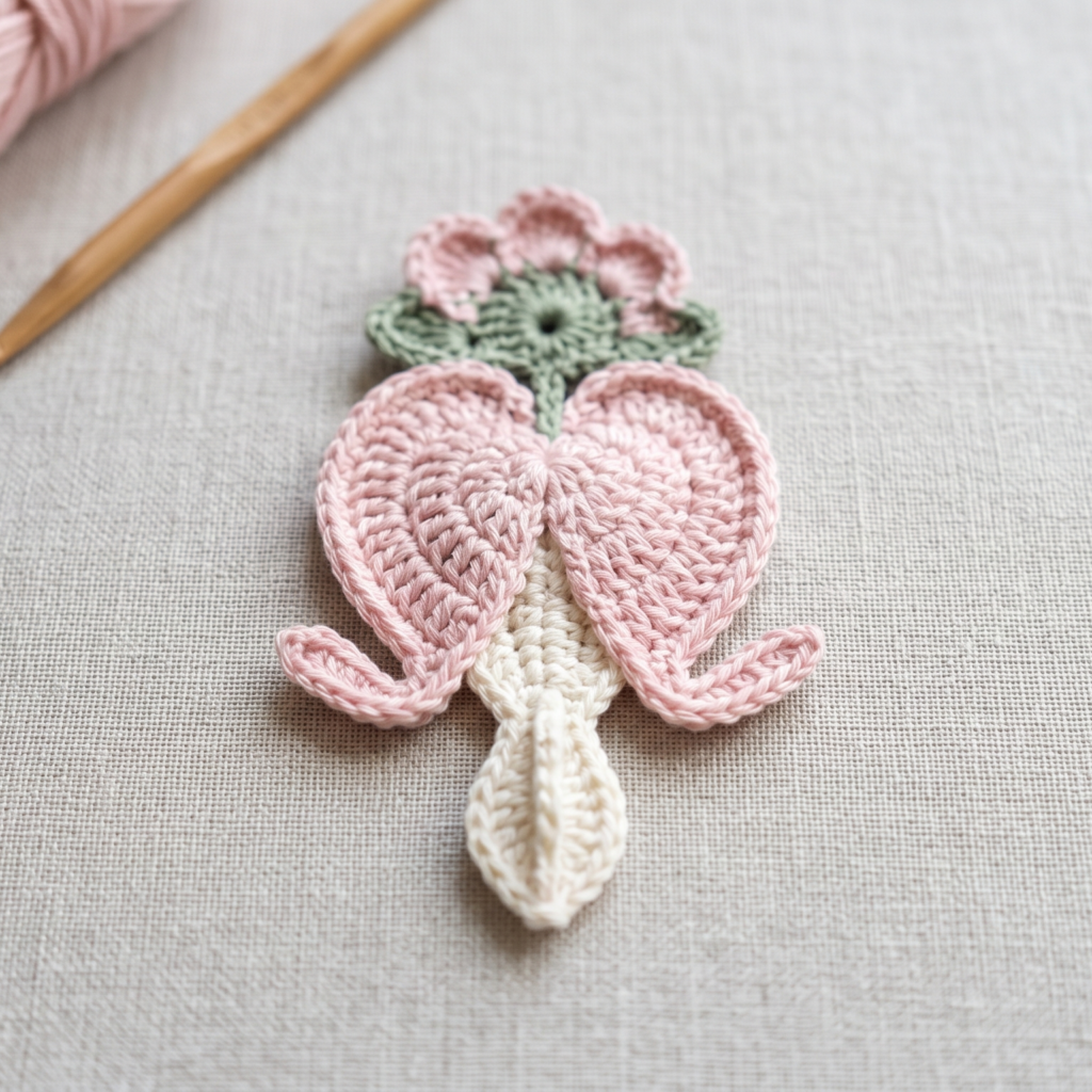 The crochet bleeding heart flower applique is elegant, romantic, and a little whimsical. The real flower has a very distinctive hanging shape, and that makes this applique especially unique. It is a wonderful choice if you want a floral motif that feels graceful and a little more unusual than a standard blossom. This flower looks lovely on shawls, blankets, garden-inspired bags, and decorative home items.