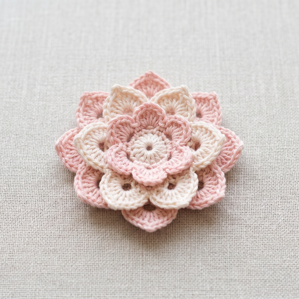 The crochet lotus flower applique is calm, beautiful, and highly decorative. Lotus flowers are known for their layered petals and symmetrical shape, which make them especially stunning in crochet form. This design works very well on blankets, meditation pillows, bags, and special handmade gifts. It can be made simple or detailed depending on how many petal layers you want to include.