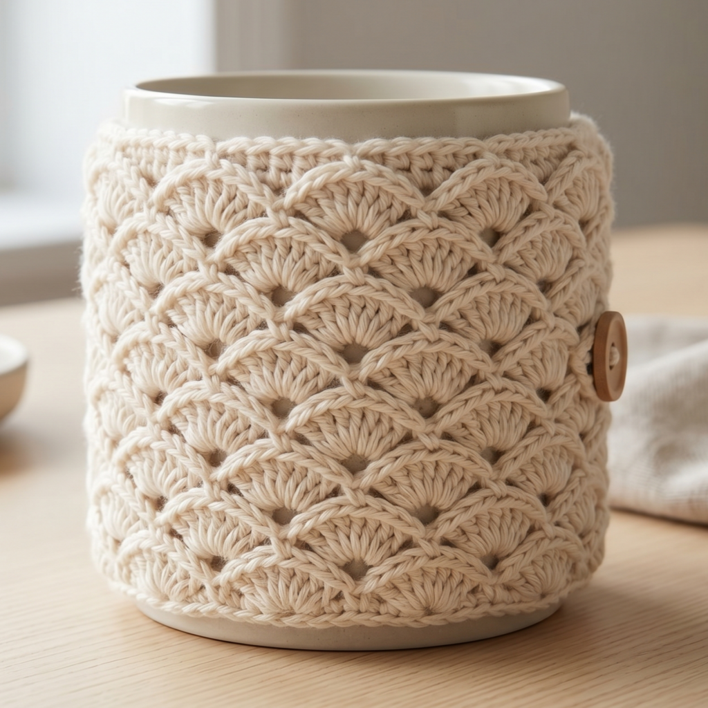 A scallop mug cozy feels soft, elegant, and a little feminine. The scalloped edge adds a sweet decorative detail that makes the cozy feel special without being too complicated. It is a lovely pattern if you want a cozy that feels polished and pretty.