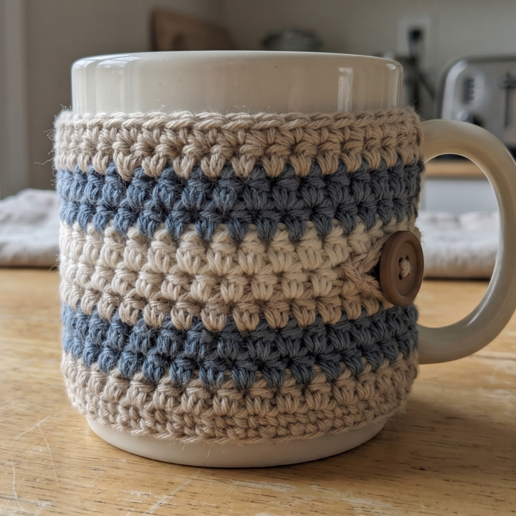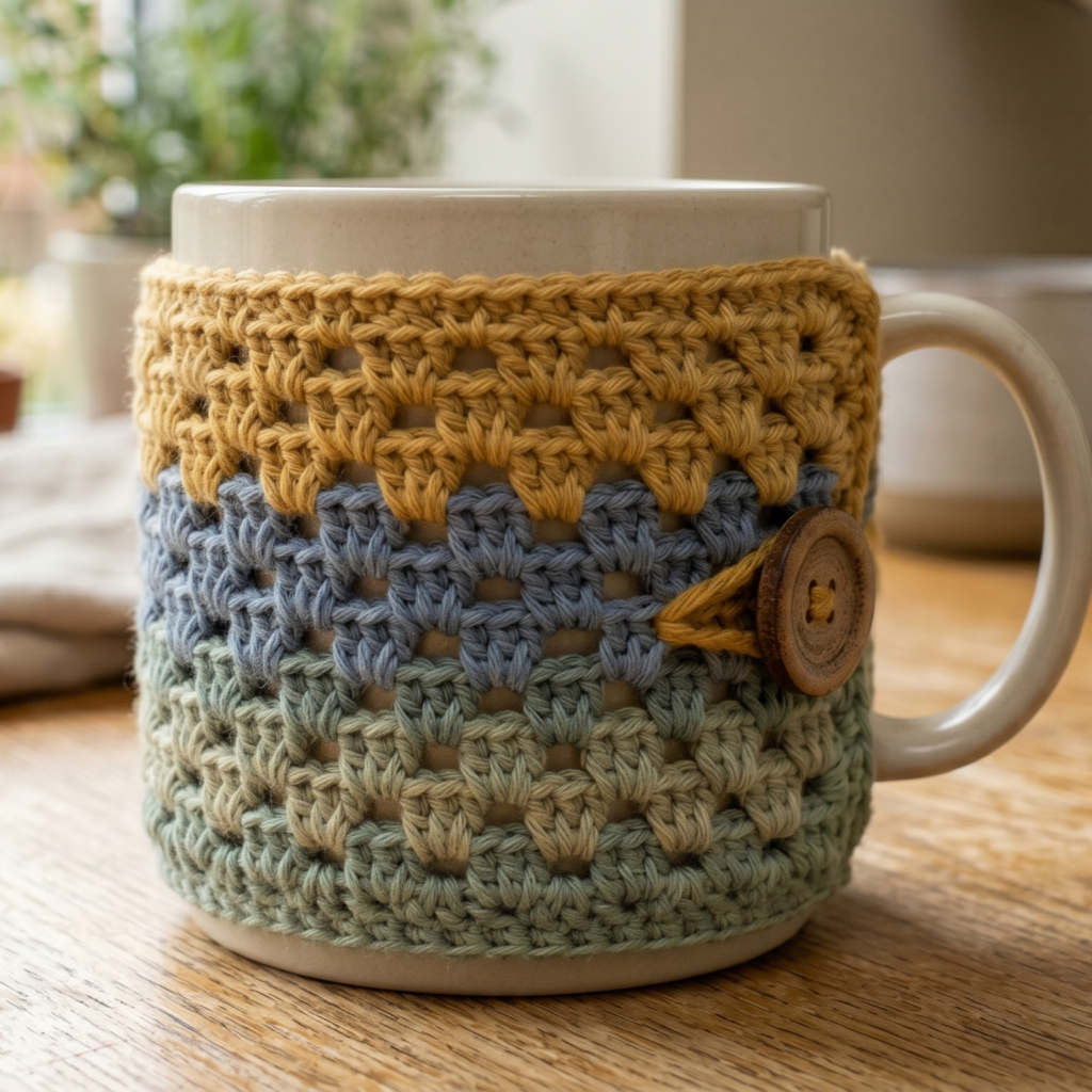 A granny stitch mug cozy is classic, cheerful, and full of charm. The familiar granny texture makes it feel cozy and handmade in the best way. It is also a great beginner-friendly project because the stitch pattern is easy to repeat and very satisfying to work.