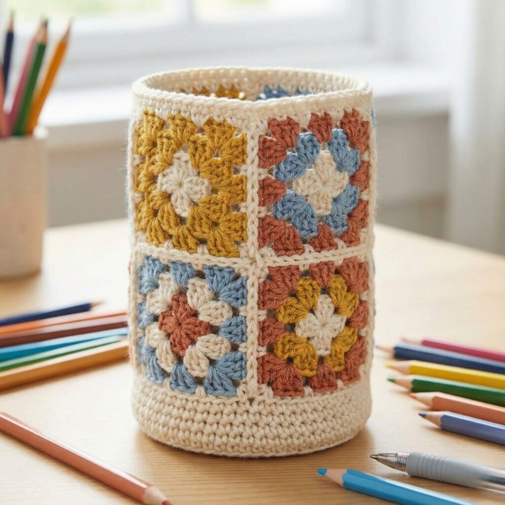 This charming pencil holder combines classic granny squares with a practical cylindrical shape, making it both decorative and functional.