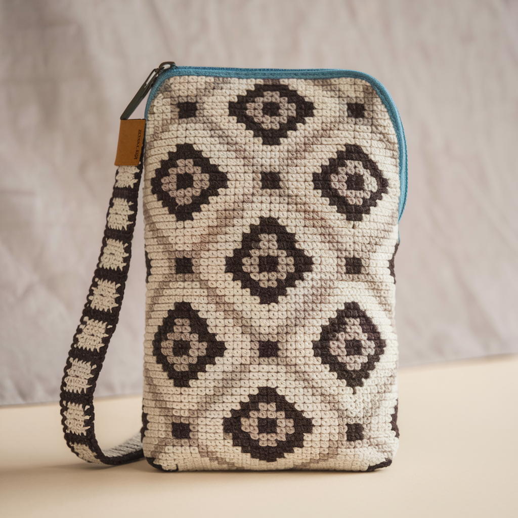 - When panel height equals phone height, fold and seam sides or make two panels (front motif + back motif) and join. Mosaic produces a sturdy fabric; lining optional but recommended for polish.