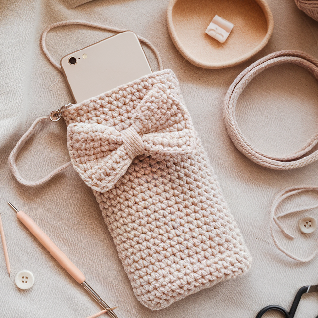 - Use super-bulky yarn + big hook for a chunky, modern phone pouch.