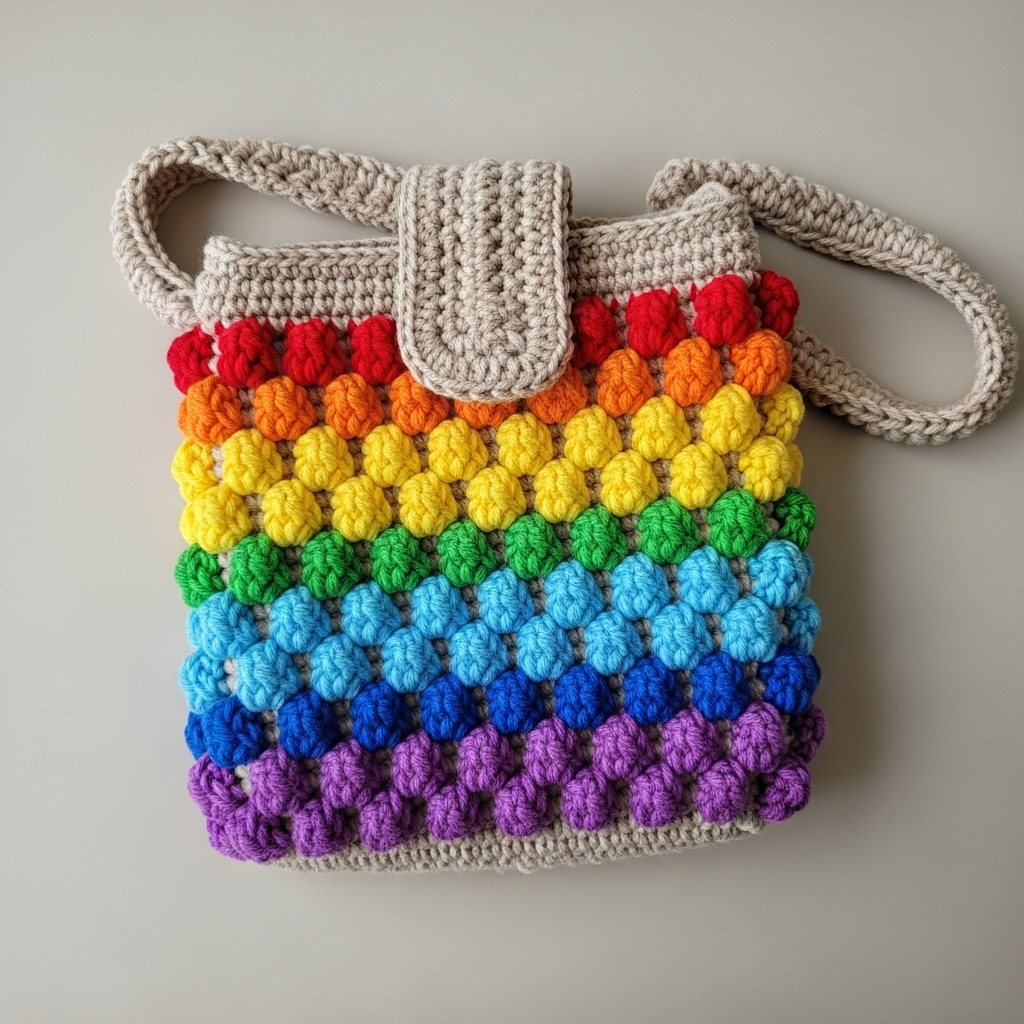 - Work one row of bobbles per color and then 1–2 rows of neutral sc between color bobble rows to let each stripe stand out. Repeat rainbow order across the panel.