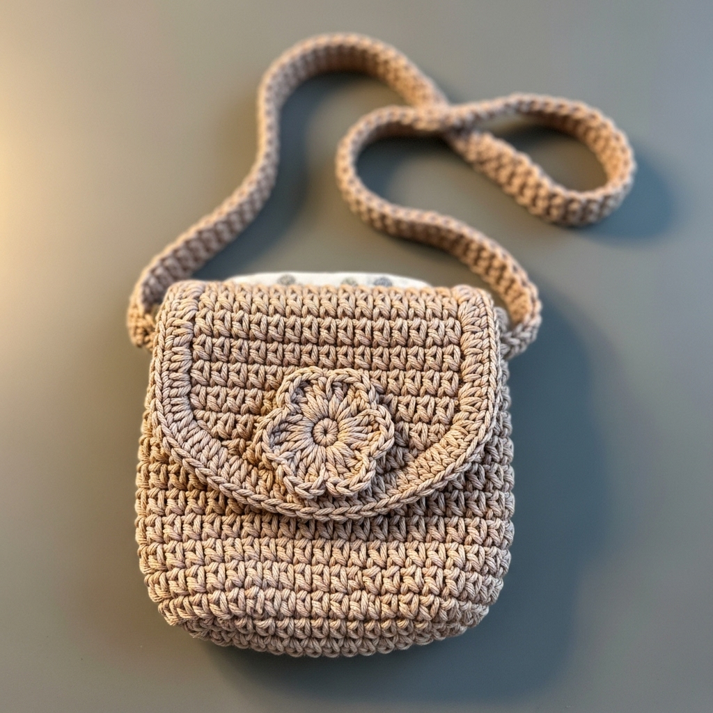 A tiny boho-inspired saddle bag with a textured flower applique on the flap and a soft, crocheted strap. Simple, sweet, and perfect for toddlers who like to carry small treasures.