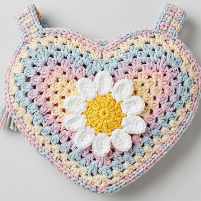 A tiny granny-style purse built from heart-centered granny motifs with small daisy centers — classic meets playful. The granny pieces are joined to form the front and back, producing an attractive patchwork effect.