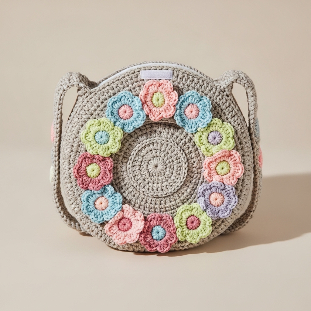 A sweet circular bag whose front is decorated with a ring of small crocheted flowers surrounding a central medallion. The strap is crocheted and anchored into the side seams. This design is picture-perfect for little ones.