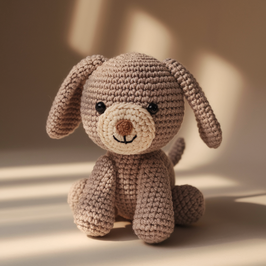 - Sew muzzle first, embroider nose and mouth. Position ears and legs carefully. Add a tiny collar (ch 16, sl st to join) if you want.