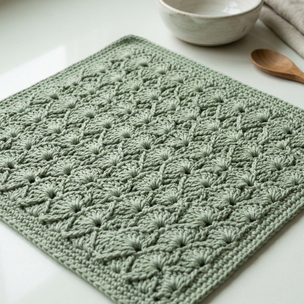 An interlocking shell stitch dishcloth is soft, decorative, and wonderfully practical. The shell texture gives the cloth a pretty layered look that feels a little fancy while still being fully functional. It is a great option if you want a dishcloth that looks beautiful enough for gifting but works hard in the kitchen.