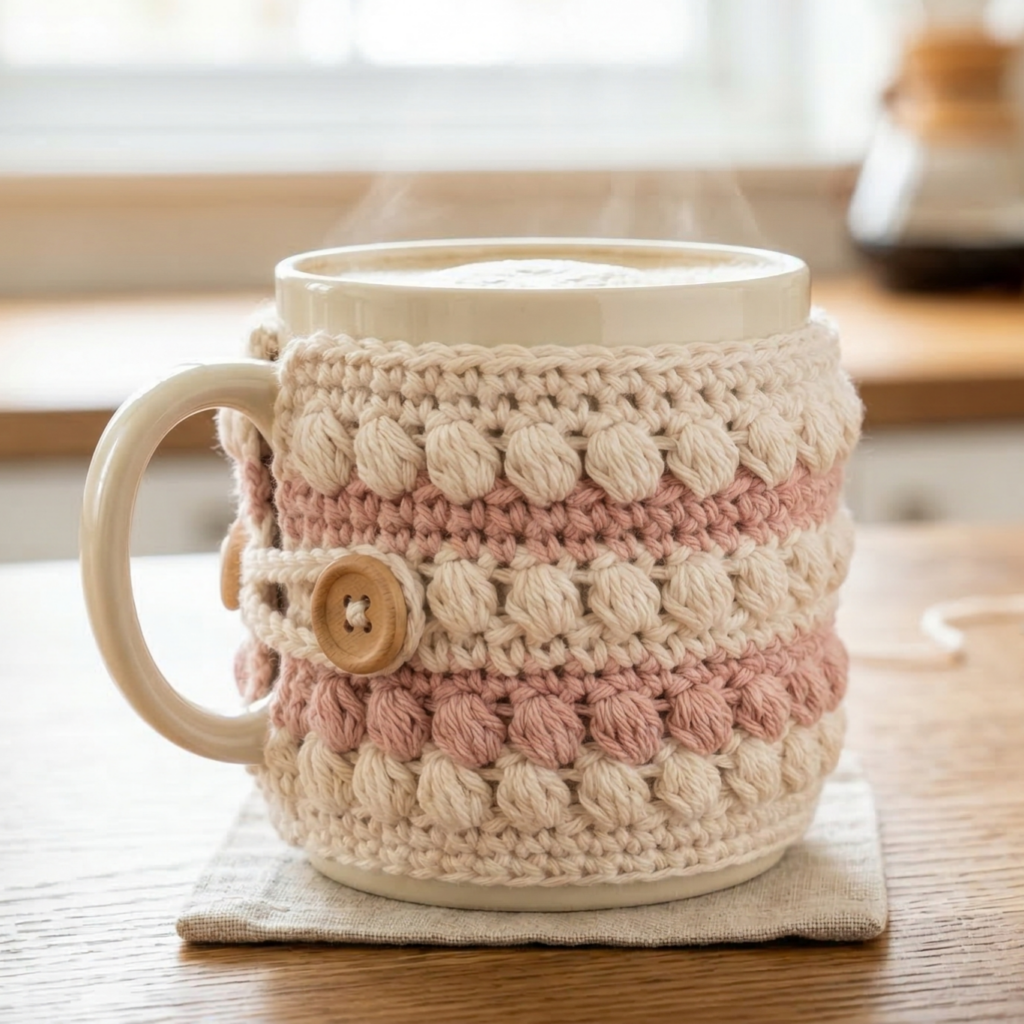 A mug cozy is a fast project that adds charm and keeps your hands comfortable while holding a warm drink. Puff stitches give it a soft, textured look.