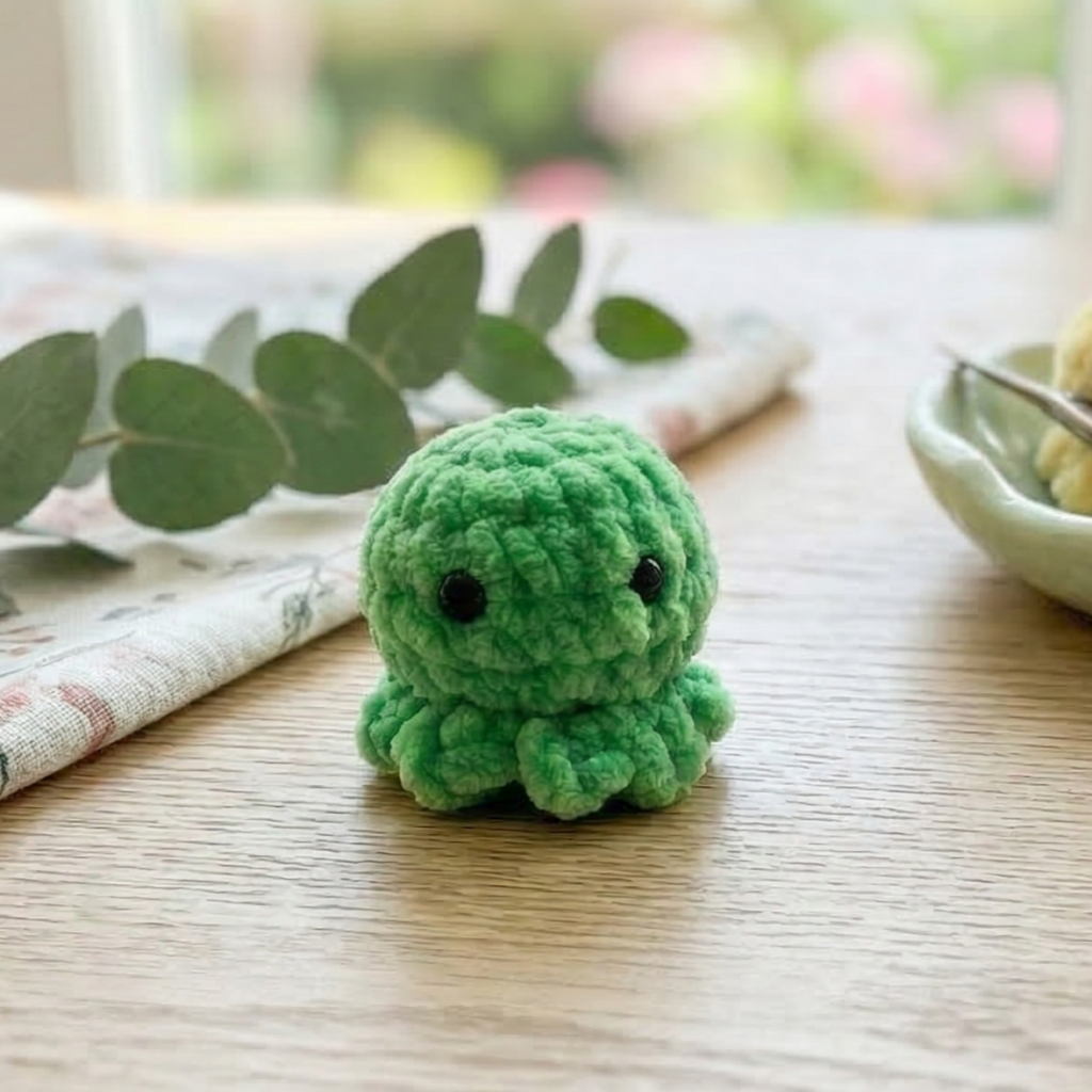 A baby octopus is one of the quickest amigurumi projects because the body is tiny and the tentacles are simple curls. It is cute, squishy, and perfect for scrap yarn.