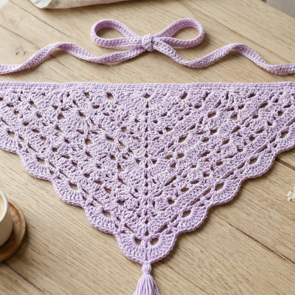 Repeat the lace pattern row by row until the bandana reaches the size you want. Because the design is open and delicate, it works up quickly. The lacy spaces add a light, breathable look that feels perfect for spring and summer.