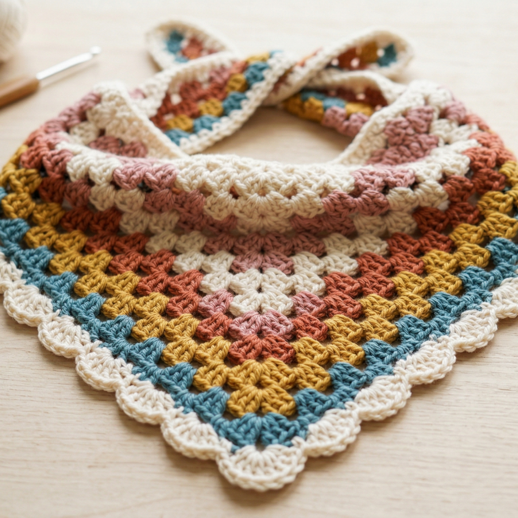 A scallop granny triangle bandana blends classic granny stitch texture with a gentle scalloped edge. It has a nostalgic handmade feel that is easy to love because it looks charming without needing advanced skills. This is a great beginner project if you want a pattern that feels playful and familiar.