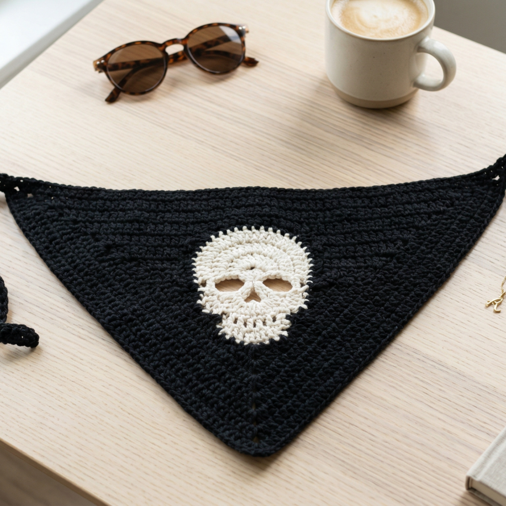 A skull motif bandana is bold, edgy, and full of personality. It is a great choice if you want a beginner-friendly project that feels a little more daring and unique. The skull detail can be made in a simple motif or repeated along the bandana for a more striking effect.