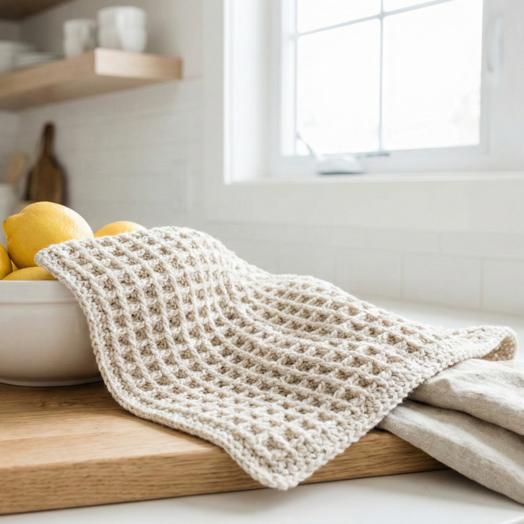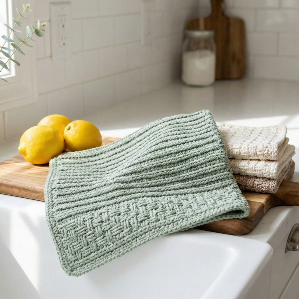 Why this design? The Farmhouse cloth uses linen/moss stitch or a simple basketweave to mimic homey woven textures — stylish and functional.