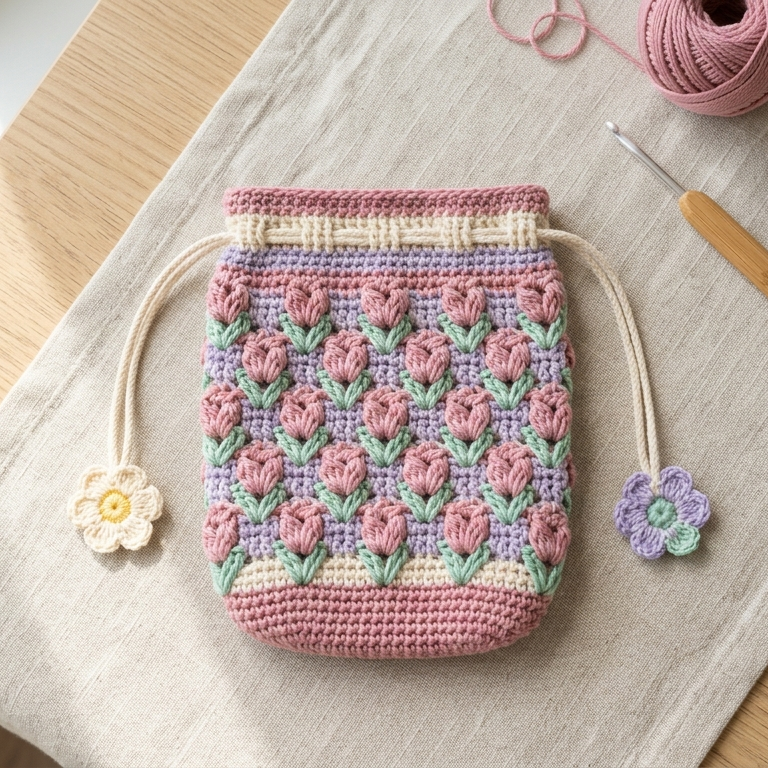 A tulip stitch drawstring pouch is soft, textured, and beautifully feminine. The tulip stitch gives the pouch a lovely floral surface that feels elegant without being too complicated. This pattern is great if you want something small and pretty that works well for gifts or personal storage.