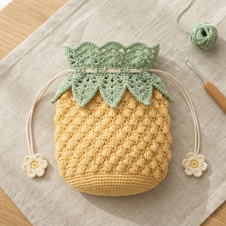 A pineapple inspired drawstring pouch is bright, textured, and cheerful. It is the kind of project that feels tropical and fun while still being practical. The pineapple-inspired texture gives the pouch a lovely decorative surface that stands out beautifully in small handmade gifts or accessories.
