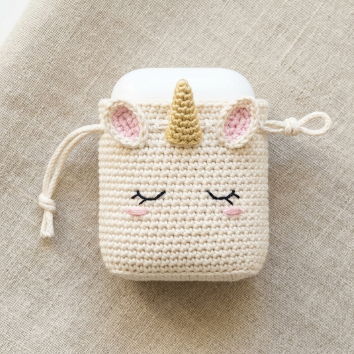 A unicorn face AirPods drawstring pouch is playful, magical, and wonderfully cute. It is a perfect mini accessory for earbuds or tiny items. Because it is small, it works up quickly while still giving you a chance to add sweet character details like a horn, ears, and a tiny face.