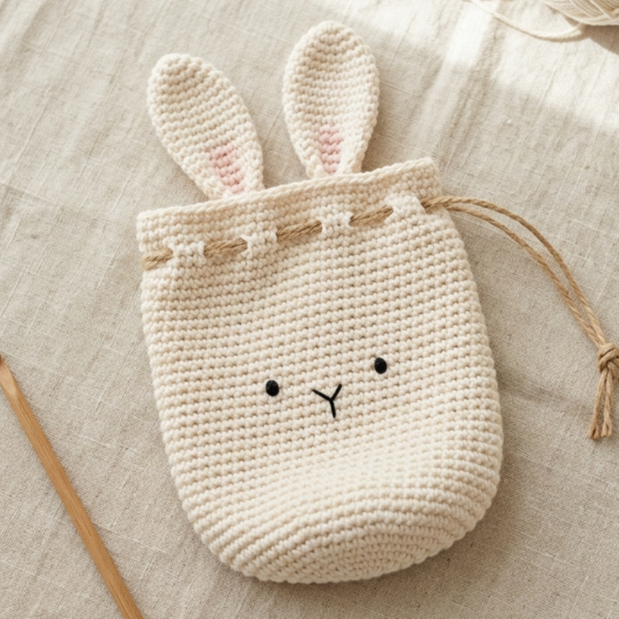 Weave in ends carefully and make sure the ears are secure. If needed, lightly shape the pouch with your hands so the bunny features sit neatly. The finished piece should feel soft, cute, and practical.