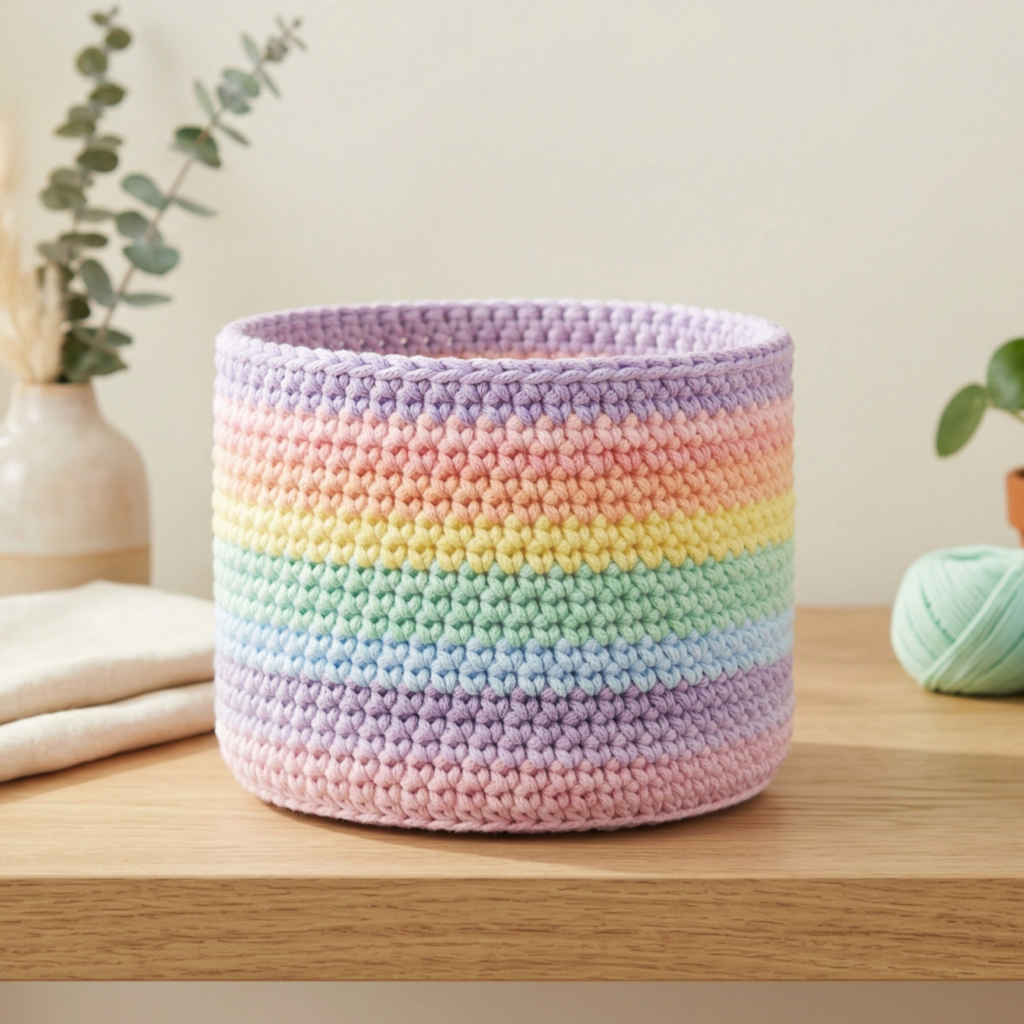 Rainbow baskets are especially fun for gift sets or children’s spaces. If you want a softer version, use pastel rainbow shades. If you want a bolder look, use bright colors with strong contrast. This is also a great project for yarn scraps.