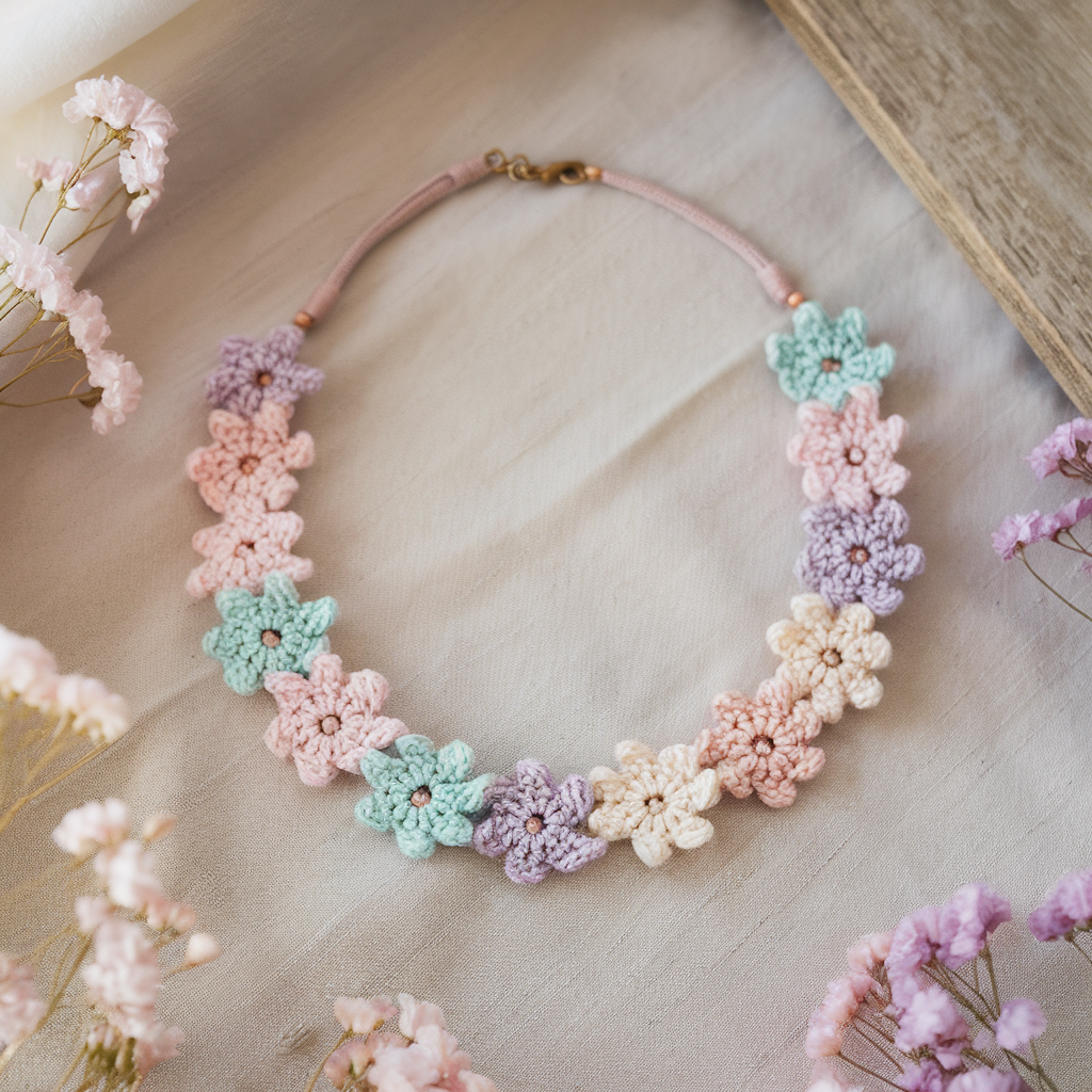 - Make a thin crocheted tube (sc in continuous rounds over 6–8 ch and slip-stitched into tube) long enough for necklace ends. Sew each tube end inside terminal flower and use jump rings/clasps.