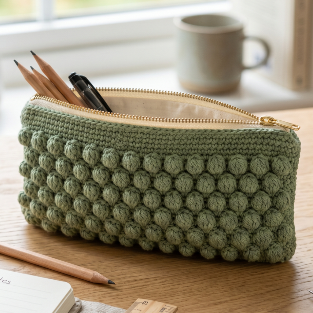 A bobble stitch pencil pouch is playful, textured, and full of personality. The raised bobble texture makes the pouch feel fun and tactile, while the compact shape keeps it practical for everyday use. This is a great beginner project if you want something that looks more detailed without being too difficult.