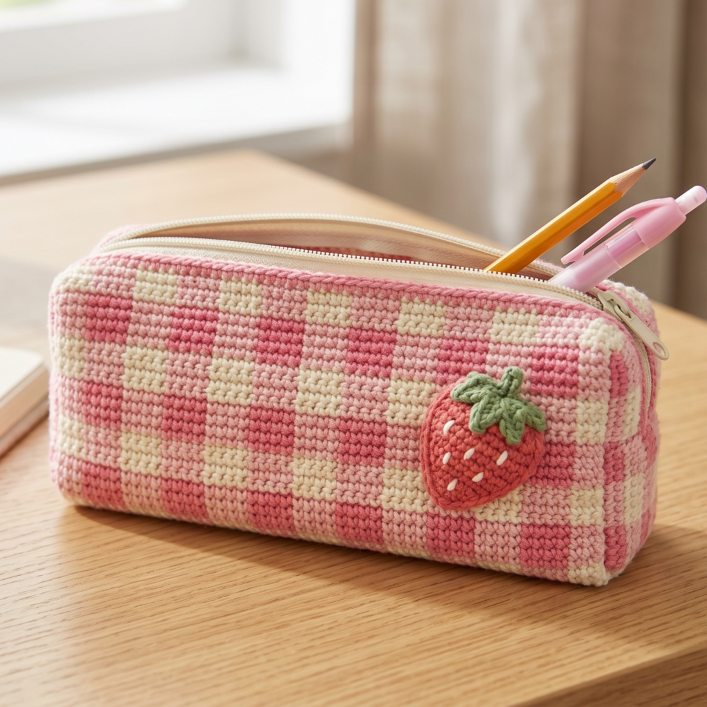 3. Crochet Checked Pencil Pouch with a Strawberry Appliqué Pattern