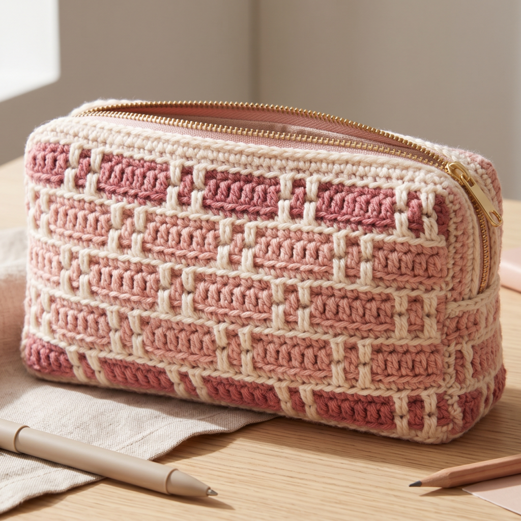 A mosaic brick stitch pencil pouch feels modern, textured, and a little more graphic. The brick-like pattern creates a structured surface that looks impressive but is still accessible for beginners. Using pink shades makes the pouch feel soft and stylish at the same time.