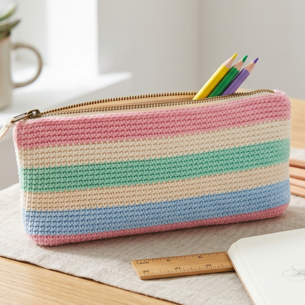 A candy stripes pencil pouch feels cheerful, colorful, and easy to love. The striped design gives it a fun and youthful look, while the simple structure makes it an excellent beginner pattern. It is a great choice for school supplies, gifts, or stash-busting leftover yarn.