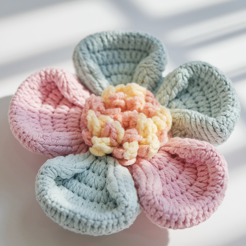 - Rnd 3 (petals): Into each chain loop work: (sc, hdc, 3 dc, hdc, sc). Repeat for all loops and join with sl st. This creates full, rounded petals.