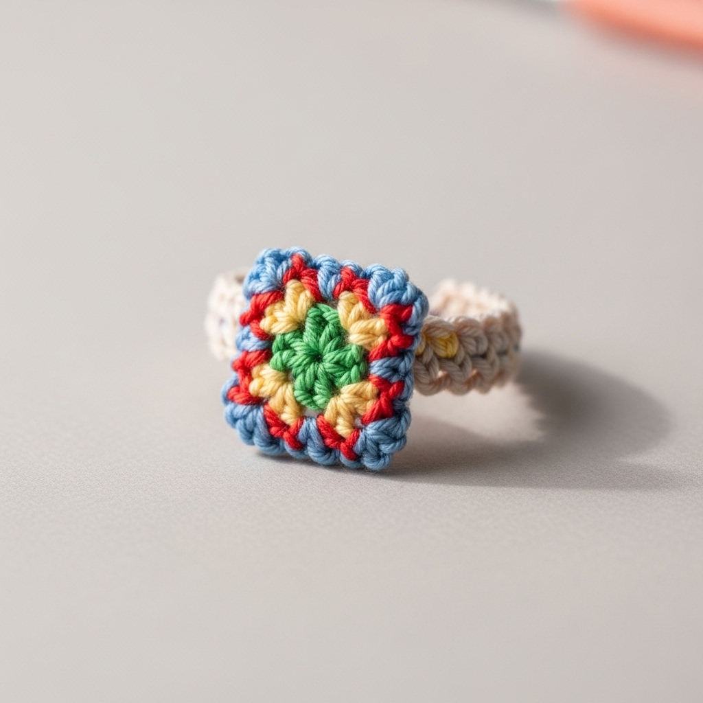 Overview: A tiny granny-square applique turned into a ring. Retro, colorful, and perfect for using small yarn scraps. This pattern produces a flat square on top of a sturdy band.
