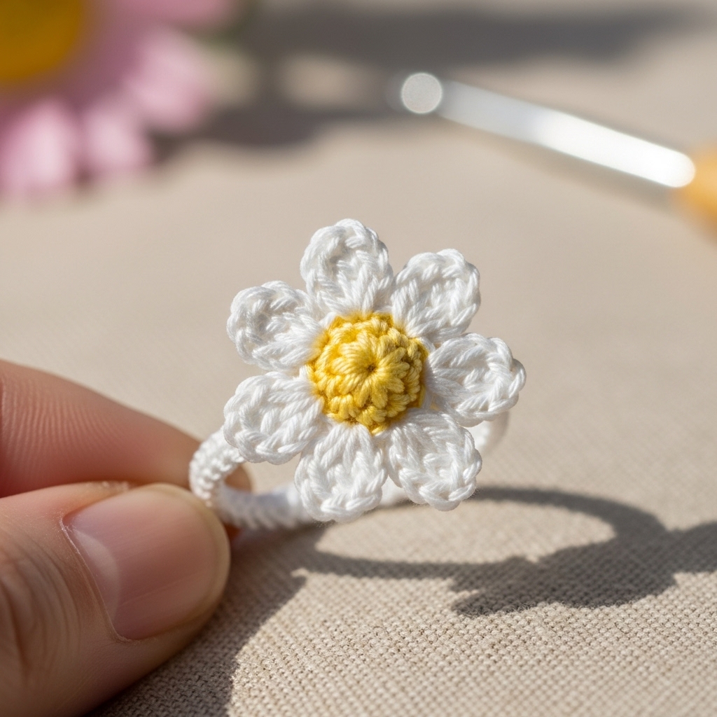 Finished size (example): Daisy diameter ~0.9–1.2 in; band medium circumference ~1.9 in.