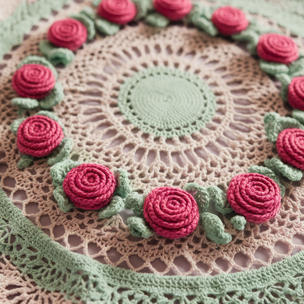 Pattern concept: Work a flat lace doily base, then crochet small spiral roses separately and sew them on for dimension.