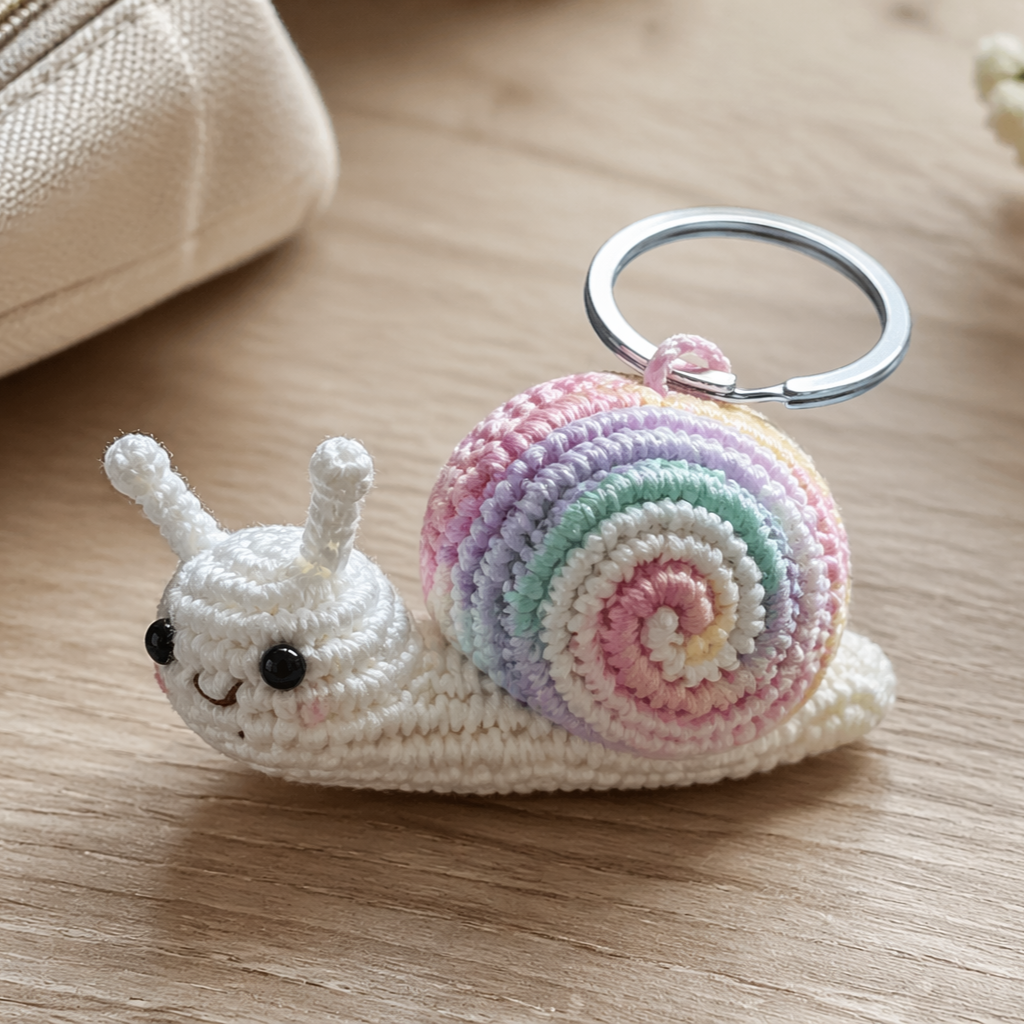 A candy stripes snail plush keychain is whimsical, colorful, and full of charm. The snail shape is already adorable, and the candy stripe shell makes it even more eye-catching. This is a fun pattern if you want something playful that also lets you use bright colors and soft curves.