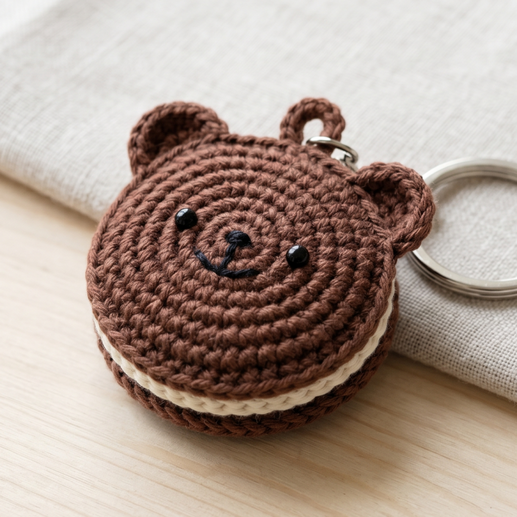 Weave in all ends carefully and adjust the face and cookie layers until they sit evenly. The final piece should feel playful, soft, and ready to clip onto keys or bags.